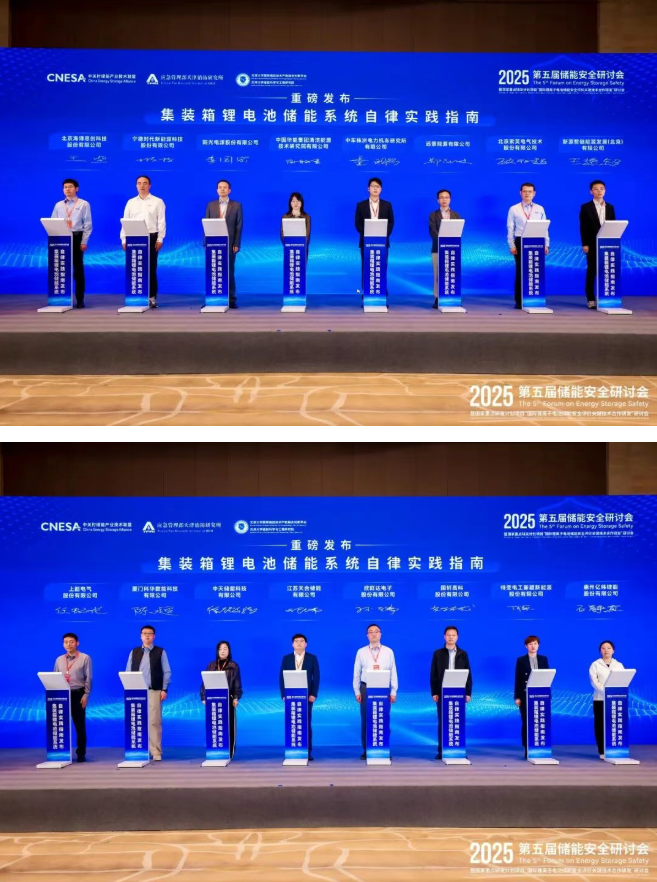 [2025年10月16日,天津] —— 今日,在第五届储能安全研讨会暨国家重点研发计划项目“国际锂离子电池储能安全评价关键技术合作研发”研讨会现场,一项关乎储能产业未来健康发展的里程碑成果——《集装箱锂电池储能自律实践指南》(以下简称《自律实践指南》)重磅发布。该文件由中关村储能产业技术联盟牵头,联盟常务理事会成员等25家行业龙头企业共同发起制定,是行业首份针对集装箱锂电池储能系统的规范性指导文件,也是行业首次将共识转化为系统性实践规范。