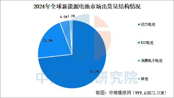 新能源电池市场的主要终端应用包括动力电池、ESS电池及消费电子电池。其中,动力电池占据主导地位,2024年全球动力电池出货量1020.1GWh,占比73.2%。ESS电池紧随其后,出货量292.2GWh,占比21.0%。消费电子电池出货量占比较小。
